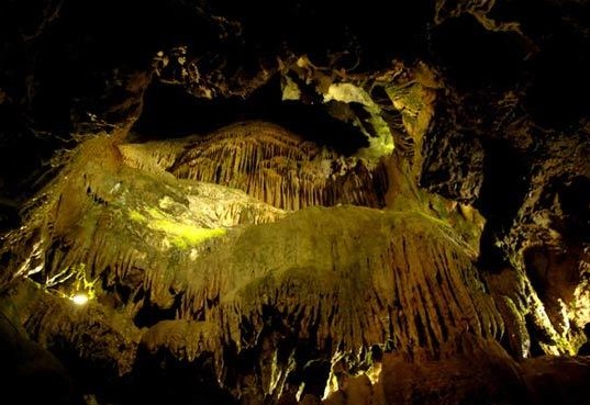兜率巖位于資興市東江水庫中的一座島嶼上,峭壁臨水,山腰有所廟宇,叫“兜率庵”,庵的后面便是兜率巖洞。兜率巖洞長5公里多,內(nèi)有銅鐘洞、鑼鼓洞、彩石洞等,可謂洞中有洞。期間鐘乳倒垂,天然物象。洞底許多晶瑩透明的細(xì)石,用燈光照射,光芒閃爍,宛若天河群星,璀璨奪目。