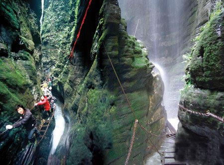 坐龍峽圖片 坐龍峽風景區(qū)位于古丈縣河西鎮(zhèn),與“芙蓉鎮(zhèn)”--王村一水之隔。經由300萬年大自然的風吹、水蝕而成,一直隱逸于湘西茫茫十萬群山之中。它長約3500米,最大高差達300余米;寬處不足丈余,窄處僅容一人通過;谷內絕壁縱疊,溪瀑橫懸,崖樹斜逸,異草遍坡。