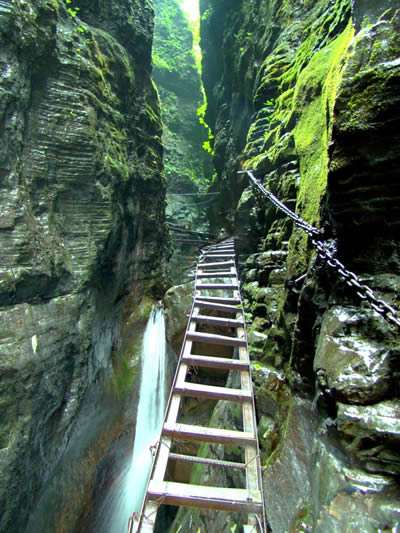 坐龍峽風景區(qū) 坐龍峽擁有中國第一條特種游道。所有游道均建于峽谷深處,依山取勢,既經細心雕琢聽卻又渾然天成。粗樸的板栗木棧道,可以讓你零距離的親近那一潭碧幽、聽聞山泉叮咚;精巧的跳墩,可以讓你媳戲流泉、觸感溪瀑;原質的石坎道,讓你不得不調動全部的身心能量悉心攀援、感悟峽谷;有驚無險的鐵梯,讓你伴著腳下轟鳴的溪水,在驚怵中體味一份快慰。出口處的土家山寨,保留了古樸獨特的生活習俗。一塊臘肉就一口醇香的“苞谷燒”會讓你洗去所有的疲憊,在輕松中憨厚的主人向你講述過去強人出沒的故事......