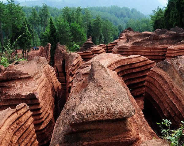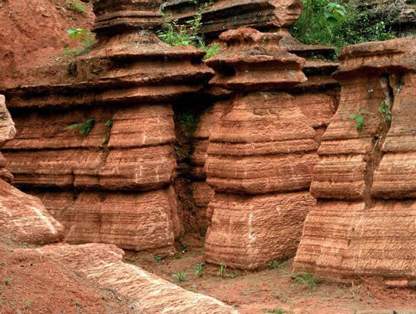 紅石林 告別船工后一切便突然安靜下來(lái),過(guò)山谷的小路沒(méi)有人家,偶爾傳來(lái)幾聲清脆的鳥(niǎo)叫。穿過(guò)幾座隘口,峰回路轉(zhuǎn)后“石林”漸漸露臉,石頭的顏色是由灰白到棕紅,變幻而又使人聯(lián)想。間或一棵參天大樹(shù),或是綠竹三兩棵,則又是另一番景致了。于高于低、于肥于瘦的石林,于石于樹(shù)、于濃于淡的色彩,顯得雄奇又雋秀,并透露出一種清靈飄逸。 這些石柱不但顏色各異,而且大小不等。有的高達(dá)七、八米,而有些則像半埋于地下的巨獸骨架。一位村民告訴記者,現(xiàn)在石林沒(méi)有以前壯觀,都長(zhǎng)渣子(灌木)了。原因是由于山頂樹(shù)木減少,雨水將泥土帶下山,很多石頭都被埋在土下,后來(lái)這些地方都開(kāi)墾了農(nóng)田,石林也被永久覆蓋。 由于泥土覆蓋,石林被切割成一個(gè)個(gè)小區(qū)域,有些隱蔽在果林中,而有些則像突然從天而降,散落田間。