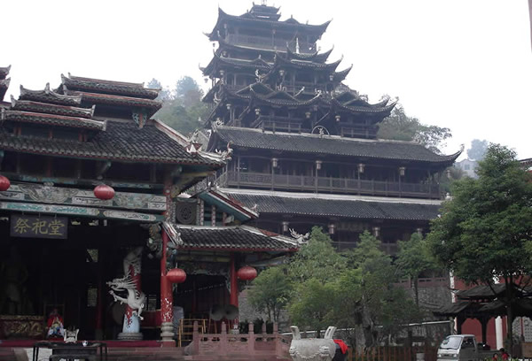 土司城 土司制度初建于五代十國(guó)時(shí)期,到了明朝己非常成熟了,土司王有無(wú)上的權(quán)威,在湘西有三大土司王分別是桑植土司向氏、永順土司王彭氏、慈利土司王張氏,其中又以永順溪州土司彭氏實(shí)力最強(qiáng)。其它土司王都為自己修建一座土司城,唯有彭氏分別在永定、永順修建了二座土司城。在永定的土司城內(nèi),彭氏為顯示其地位,修建了湘西最高的一座高達(dá) 48米,共12層的吊腳樓,整棟樓竟無(wú)一根鐵釘,堪稱(chēng)土家吊腳樓建筑史上的奇跡,此樓于2002年9月被評(píng)為最高吊腳樓,榮獲世界吉尼斯之最,與此同時(shí)土司城內(nèi)舉辦一千人參加表演的毛古斯舞蹈活動(dòng)獲得圓滿(mǎn)成功,同時(shí)獲得世界吉尼斯之最。進(jìn)入土司城,首先看到土司城迎賓儀式,土家漢子迎賓鼓,吹牛角、放沖,土家姑娘攔門(mén)歌,敬攔門(mén)酒,進(jìn)入城內(nèi),在祭祀堂前舉行百人土家大祭祖活動(dòng),男女老少唱擺手歌、跳擺手舞,登世界最高的吊腳樓九重天,參觀土家族千百年來(lái)文化展示。到土家山寨,聽(tīng)土家歌,賞土家族最有代表風(fēng)俗哭嫁,三棒鼓,花燈等民俗表演。