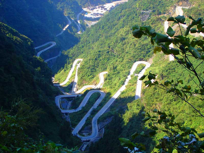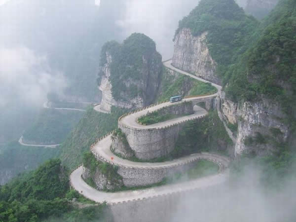 張家界天門山盤山公路有"通天大道"之稱,盤山公路全長(zhǎng)10.77公里,海拔從200米急劇提升到1300米,大道兩側(cè)絕壁千仞,空谷幽深,共計(jì)99個(gè)彎,180度急彎此消彼長(zhǎng),似玉帶環(huán)繞,彎彎緊連,層層迭起,被譽(yù)為“天下第一公路奇觀”。