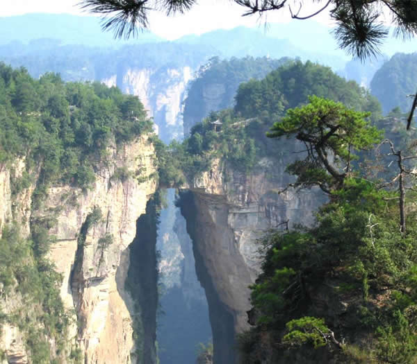張家界天下第一橋 “天下第一橋”。橋長20米,寬僅1.5至3米不等,但較平坦,可通行人。橋上蒼松挺拔,橋下云霧蕩漾,萬丈深淵。四周懸崖絕壁,水滴飛濺。踏上橋面,使人有凌空御風之感。手扶鐵欄桿,仰視,青峰飄渺于云靄繚繞之中;俯瞰,奇峰如筍群,巖壑深谷中陣陣煙嵐泛起,散而復聚。這里是張家界風景一絕,是大自然的一個奇跡。您看,兩座山峰被一條長廊連在一起,形成天然橋洞,平時吞云吐霧,氣勢壯觀雄奇.橋面寬約兩米,長20余米,絕對高度350米。橋上蒼松挺拔,橋邊古藤垂掛,橋下深不可測。遠觀此橋,云霧繚繞,橋身若隱若現,好似水中倒影一般。走在橋上,只見霧氣蒸騰,松濤呼嘯,石橋好像也顫顫悠悠,晃晃搖搖似的,令人驚心動魂。這里是張家界風景一絕,是大自然的一個奇跡。