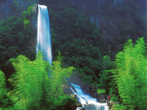 寶峰湖瀑布 湖中有兩座疊翠小島,近岸奇峰屹立,峰回水轉(zhuǎn)。泛舟漫游,只見(jiàn)一湖綠水半湖倒影,充滿詩(shī)情畫(huà)意!霸铺萑f(wàn)丈上天臺(tái),高峽平湖一鑒開(kāi),王母瑤池金扶,浣沙仙女下凡來(lái)”游寶峰湖,你就會(huì)欣賞到這樣的詩(shī)情畫(huà)意。群峰擁抱的寶峰湖,長(zhǎng)約2.,5公里,湖猶如一面寶鏡,四面青山,一泓碧水,蕩槳溫游,格外愜意。坐在船上,環(huán)顧四周,千山聳翠,俯視水中,倒影慢移,碧水照相館得群峰綠,人面桃花水映紅。真是靜極了,美極了!韓劇《九天洞》拍攝的湖水就是寶峰湖。