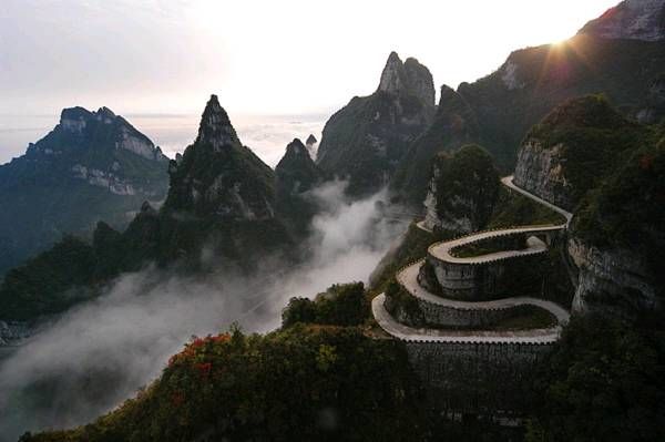 天門山盤山公路共有99道急彎,其中最為險(xiǎn)峻的一段是經(jīng)過科學(xué)的論證及設(shè)計(jì)才得以修建成功的,大家可以通過圖片看到其中公路之險(xiǎn)峻。