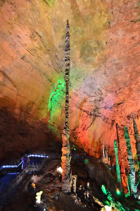 跨過中國游覽洞穴中跨度最大的石拱橋天仙橋,便進(jìn)入黃龍洞第三層天柱街了。天柱街是天上的街市,是神仙做生意的地方。天柱街以繁華似錦、春意盎然的“天上街市”為中心,西街花果山石柱石花重重疊疊,東街“天堂宮” 穹形洞頂高大幽深。順著長長的崩塌的斜坡往上看,兩根大石柱及壁流石被地下水溶蝕形成了奇妙的空洞,因從不同的地方可以敲出奇妙而悅耳的音符得名“石琴山”。一九八四年,中央電視臺(tái)拍攝電視專題片《地下明珠——黃龍洞》的時(shí)候,就是在這兩根石柱上敲擊出了一曲完整的《賣報(bào)歌》。
