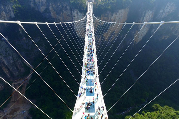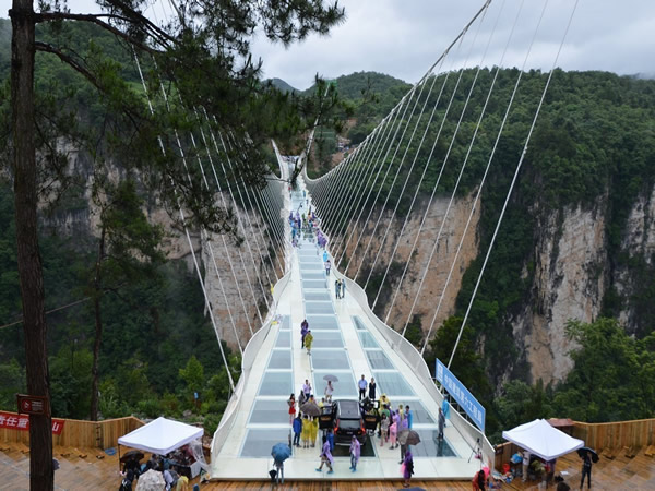上 午:早餐后07:30至08:00 準(zhǔn)時(shí)統(tǒng)一集合乘車赴“小九寨溝”之美譽(yù)的張家界大峽谷景區(qū)。(車程約60分鐘)【張家界大峽谷+玻璃橋B線】(門票已含),(已含首道門票,含游船費(fèi),游覽時(shí)間約3個(gè)小時(shí)),零距離接觸張家界“奇峰三千,秀水八百”的神奇瑰麗。觀天仙水瀑布、蝴蝶泉瀑布、竹仙泉、翠潭攬瀑;行于一線天、天梯棧道、石壁裂縫、石上森林;探怪謎洞、佛手遮天、爛船巖千古流傳的未解之謎;谷中猴群歡躍,百鳥爭鳴,湖水清澈、群山倒蘸 ,鴛鴦戲水、空氣清新、絕無僅有。形態(tài)各異的瀑布群,把生命之源傾瀉得淋漓盡致;隨海拔變化的植物帶,將四季更替演繹得如詩如歌;數(shù)條彩虹,百米梭板,千年風(fēng)情,萬米長廊,把峽谷內(nèi)裝扮得如畫似錦。體驗(yàn)世界最高最長首座斜拉式高山峽谷玻璃橋【云天渡】,漫步天上人間、輕吻藍(lán)天白云、帶上你的心靈從這頭走到那頭、走過青絲到白發(fā)!挑戰(zhàn)極限,戰(zhàn)勝自我(上橋游覽時(shí)間為20-30分鐘);(玻璃橋游覽注意事項(xiàng):1、遇大風(fēng)、暴雨等極端惡劣天氣,玻璃橋有可能關(guān)閉,關(guān)閉不能通行時(shí)不退任何費(fèi)用;2、除錢包和帶有手機(jī)套的手機(jī)外,任何物品不得帶上橋;3、凡有心臟病、高血壓、恐高癥及醉酒和其他身體不適宜游覽的,請勿上橋;4、穿高跟鞋的游客不允許上橋;5、不得在橋上追逐、打鬧,拋物,不得倚靠橋上欄桿,以防身體傾斜,發(fā)生意外。6、游客在游覽過程中請聽從景區(qū)工作人員管理)!